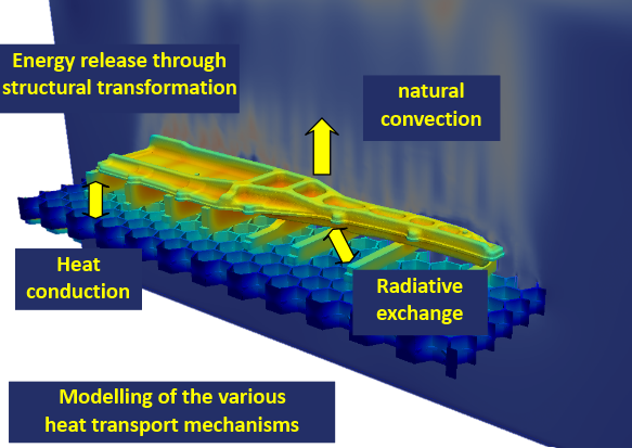 Complex transient heat transport process with a variety of transport mechanisms (natural convection, radiation, heat conduction and energy release through structural transformation) on long time scales.